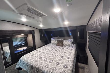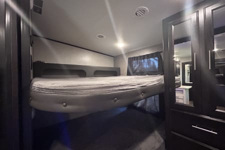 The master bedroom has a queen-sized bed, plenty of storage options and overhead lighting. The master also has its own air conditioner so you can adjust to your own liking. On the other side of the RV you will find the bunkhouse with two full-sized bunks. It's own closet, set of drawers and storage on the sides of the beds. Perfect room for the kids or guests.