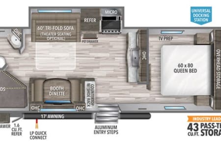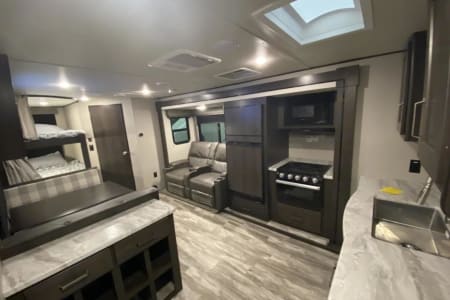 * Spacious and Comfortable: This well-designed RV comfortably sleeps up to 8, featuring a private room with queen-size master bed with a solid slide door, double bunk beds, and a convertible dinette and sofa. Enjoy ample living space for relaxation and entertainment.
