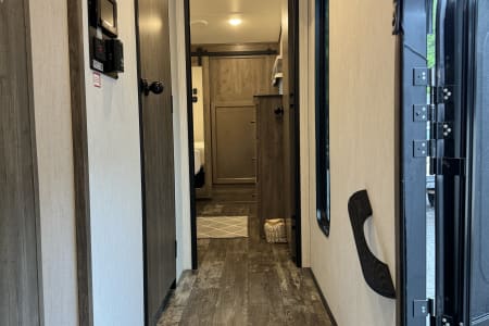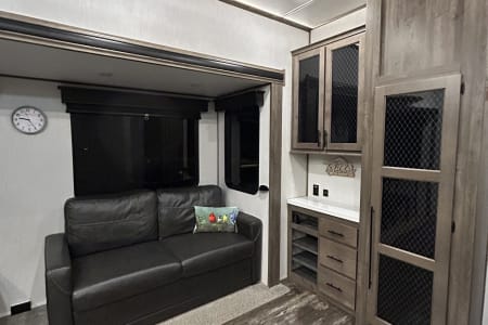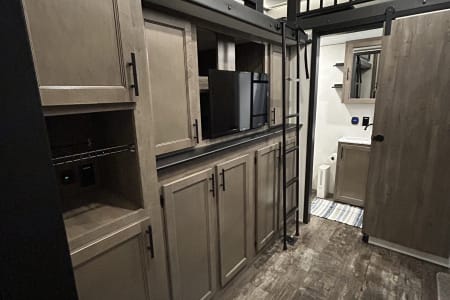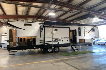 Don’t let your family ruin vacation by arguing over the bathroom - Traveling Bed’r has TWO full baths! 2022 Forest River Sabre 38DBQ! If you’re looking for something to go camping in and have fun and room for up to 8 comfortably then this is the camper for you! This thing comes loaded from the factory. Google it and you’ll see! But just a brief run down of features - memory foam mattress, large closet and dresser with plenty of under bed storage, master bathroom has a spacious shower, full size refrigerator in the kitchen with gas stove/ oven, convection microwave, tv, electric fireplace, couch bed, large sink, kitchen table with bench and two chairs, abundance of storage, two twin beds in the rear room with twin memory foam mattresses, tv, two more beds in the loft, crazy amounts of storage and closets, full rear bathroom with tub/ shower combo, outside kitchen with refrigerator, storage and sink, propane quick connection for grills, stereo inside and out, dual a/c units, gas heat, wifi enabled throughout, touchscreen controls, and more! Kitchen and bathroom linens are included. Kitchen is stocked with basic utensils, dishes, silverware, and some pots and pans. Also supplied is toilet paper, paper towels, camping chairs, and more! The kitchen includes a Keirug machine. Available for off-grid camping is the use of an external generator at an additional cost of $40 per day. Let us make your vacation relaxing and memorable with stress free delivery and set-up!