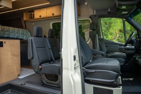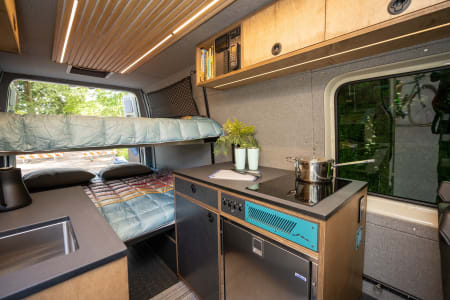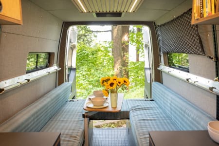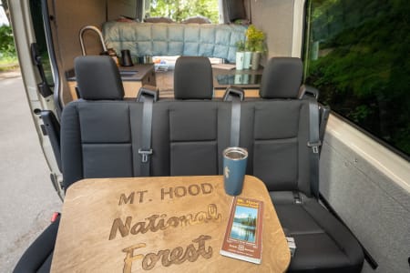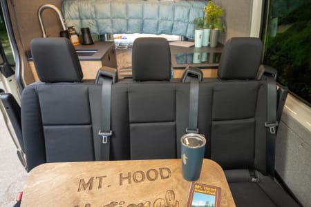 This camper van can seat up to five people for travel and can comfortably sleep four adults in the double-decker beds. Parties of four or more will lounge and visit in the front of the van. The two front seats swivel to face the rear, and there is a Lagun table inscribed with Mt Hood Forest, an iconic Oregon destination.