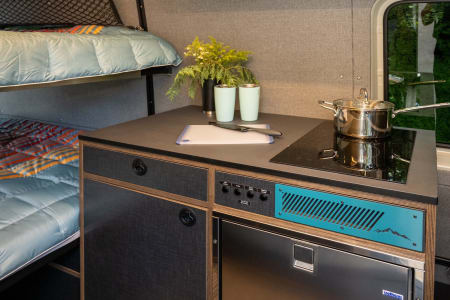 And oh the galley kitchen is lovely and stocked with the nicest dishware and cookware. Funner’s kitchen is complete with a dual-zone induction stovetop, a sink with running hot and cold water, and a built-in fridge/freezer combo to keep all your perishables cool during your trip.