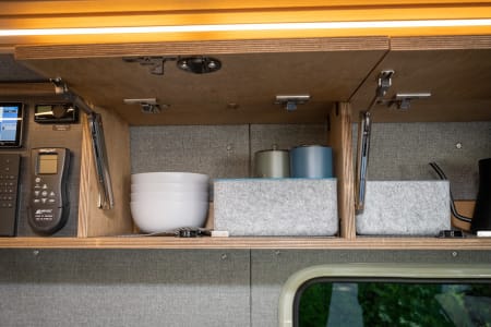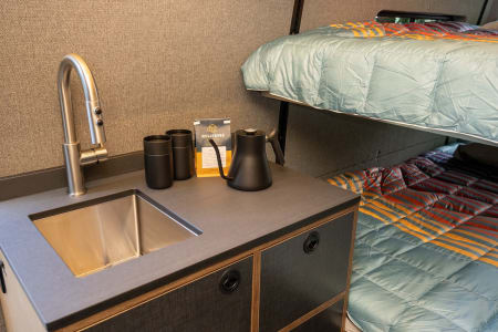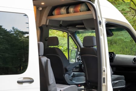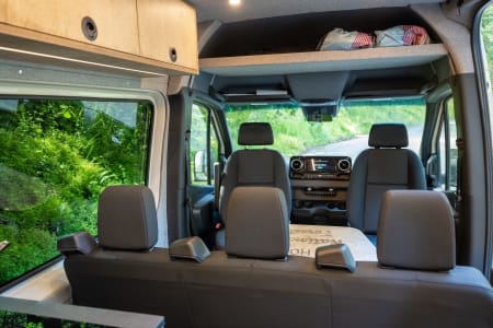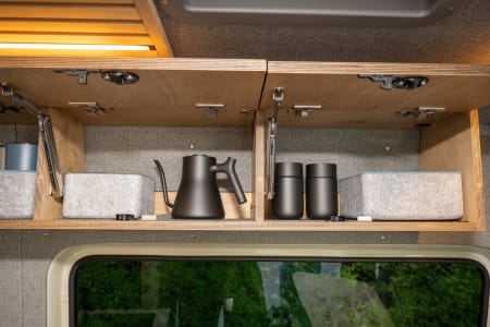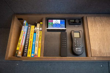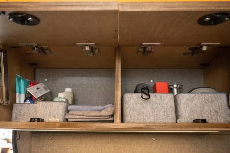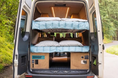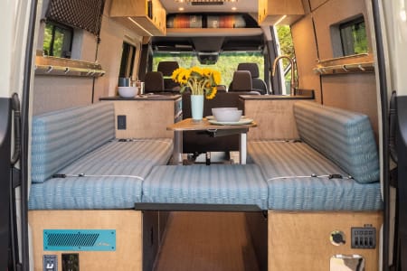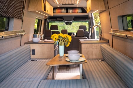 Parties who don’t need the top bed can ask to have the bed removed, which opens up a second, extremely spacious lounging area in the back of the van. That same Lagun table can also attach in the rear lounging area so you can dine or work with the back doors open. There is ample cabinetry space beneath the cushions.