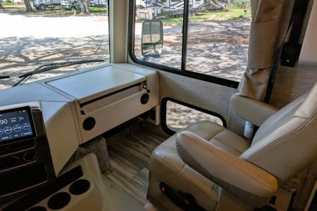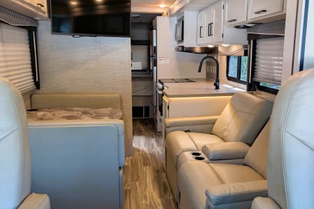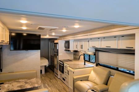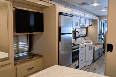 The RV includes smart TVs in both the living area and bedroom. It also has a sound system for enhanced entertainment on the road. With options for satellite TV and Bluetooth integration, you can enjoy a movie night or your favorite tunes wherever you are.