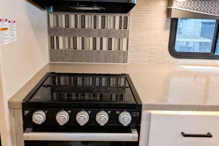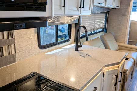 The kitchen has everything you need to cook on the road, including a refrigerator, microwave, three-burner stove, and oven. There’s also a deep sink for easy cleanup.