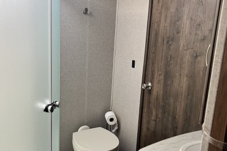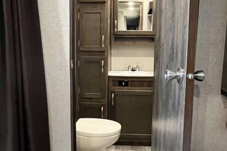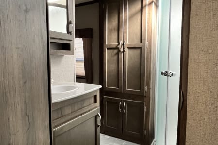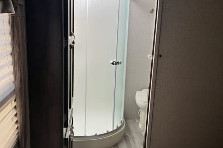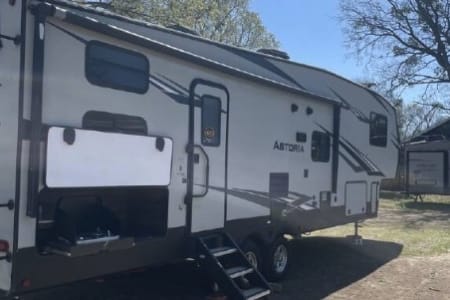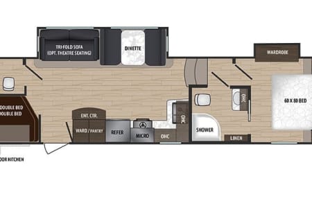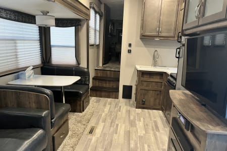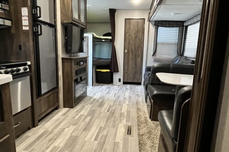 The master bed is a queen and the couch make into double size bed, The table is a twin and bunks are comfortable doubles. The slide outs adds a ton of room to move around. That combined with a good amount of counter space and kitchen amenities make fixing meals easy even if it's raining outside and everyone's inside playing games. The 2 power awnings easily increases comfortable living space outside, rain or shine. And don't forget the outdoor kitchen with grill, sink, and fridge!