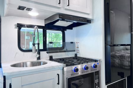 This RV is self-contained with a shower, toilet, TV, Amplified digital HDTV antenna, microwave, oven, refrigerator, freezer, A/C, heater and solar panel. Comes with cable hook up as well, on board generator. The kitchenette is equipped with common kitchen items. Super clean and ready to go!