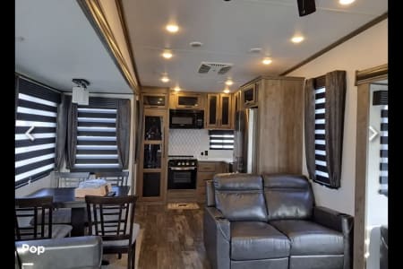 Inside, you’ll find a modern layout with plenty of living space thanks to its generous slide-outs. The fully equipped kitchen includes a refrigerator, microwave, oven, stove, and sink—everything you need to cook up your favorite meals while on the road. There’s also a roomy dining area and comfortable lounging space for movie nights or relaxing after a day of outdoor fun.