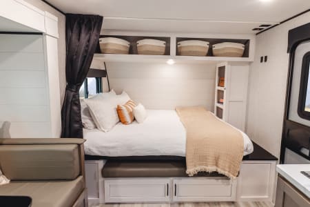 Queen-size murphy bed (Size 60X74 ) with privacy curtain – cozy and perfect for relaxing after a day of adventure in the day time turn it into a sofa.