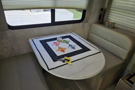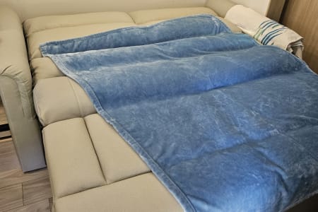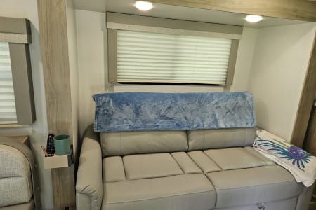 Inside, this Minnie Winnie is clean, well-kept, and thoughtfully designed with the comforts you need to brave the great outdoors in style. It features a cozy layout ideal for couples or families with a small child, and includes everything you need to relax after a day of exploring—from a comfortable sleeping area to a functional kitchen and lounging space.