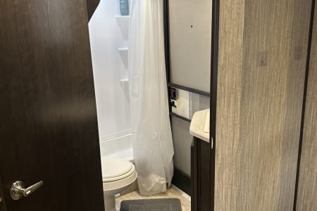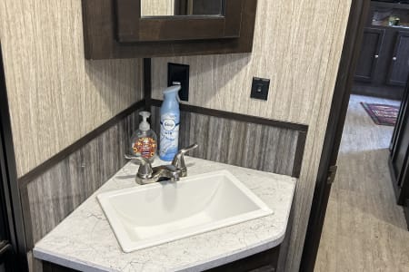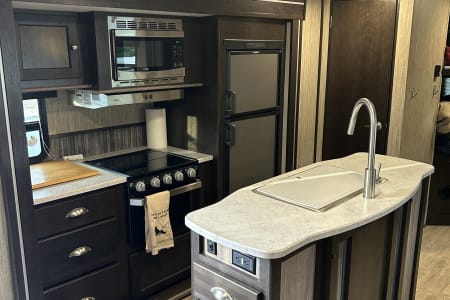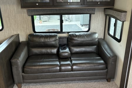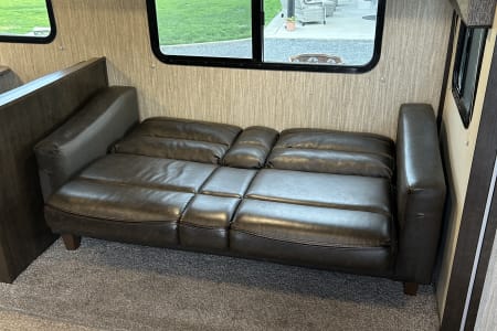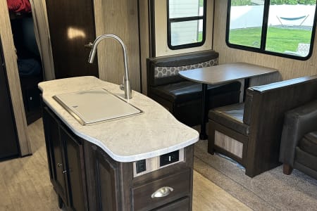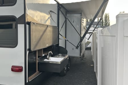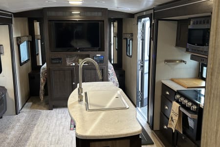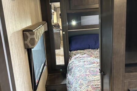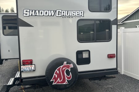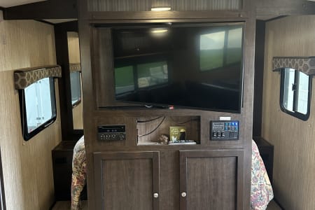 This Shadow Cruiser is perfect for hosting. Comfortably sleeps 8 adults. Large bunkhouse model with opposing slides to create spacious kitchen with walk around island and living room. Kitchen will come fully stocked with needed supplies. Queen size bed in master with sliding doors for privacy. Has oversized bunks. Couch converts to bed. Dining room table converts to bed. Outdoor kitchen with sink, mini fridge and two burner stove. Bluetooth/CD/radio stereo with both indoor and outdoor speakers. Nearly full length electric awning. Swivel tv (can pivot to view from master) with DVD player and DVDs. Roomy shower with skylight. LED lights throughout inside and outside. USB ports for charging devices when not connected to shore power.
