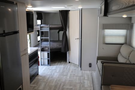 Sleeps up to 10 (MAX) – Queen bed, double over double bunks, convertible dinette & sofa