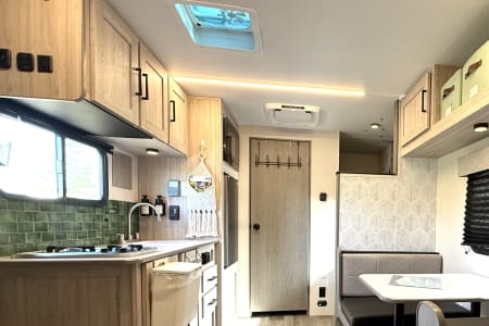 • Outdoor Setup – Relax under the awning with camp chairs, outdoor rug, table & grill available as add-ons. Your own cozy forest patio awaits.