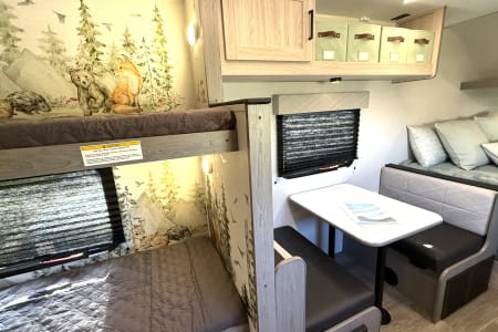 Bedding: 1 queen size bed, 2 bunk beds, dining table transforms into a bed as well.