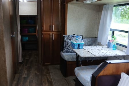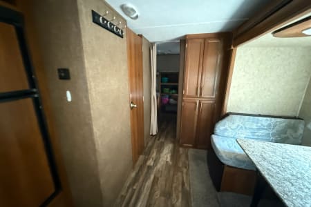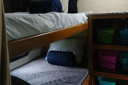 -4 camper bunks (great for kids or adults) with doorway curtain separator and tower of storage cubbies for clothes or items to be kept organized + sound machine.