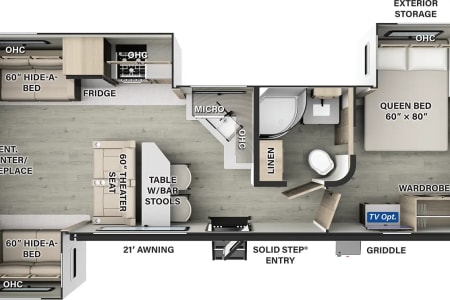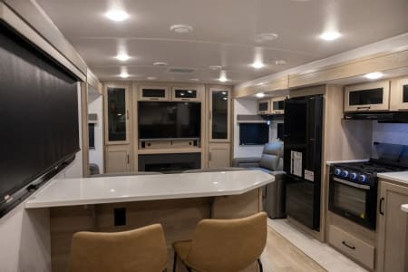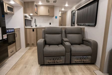 • A roomy rear living area with dual recliners, two plush sofas (convertible to a bed), TV and electric fireplace.