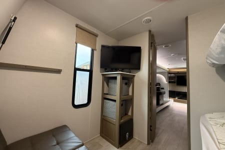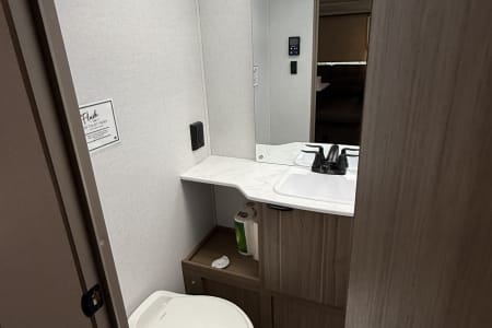 Trailer is equipped for bathroom and kitchen. Bring your own bedding.