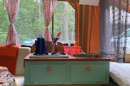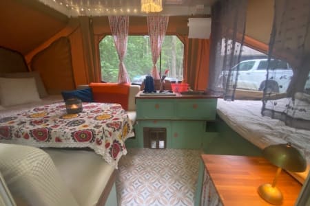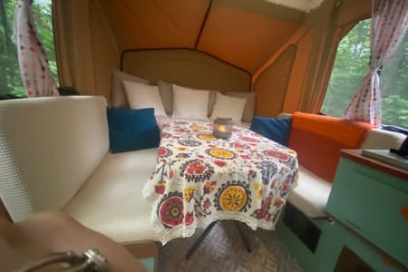 Introducing our newly renovated pop-up camper, your ticket to an unforgettable camping experience in the scenic beauty of Door County. Whether you're a solo glamper, a couple seeking a cozy getaway, a small family, or a group of friends, our retro-inspired pop-up camper is a unique haven for up to 4 guests. Imbued with warmth and character, it's been lovingly renovated to offer a distinctive touch to your camping adventure.