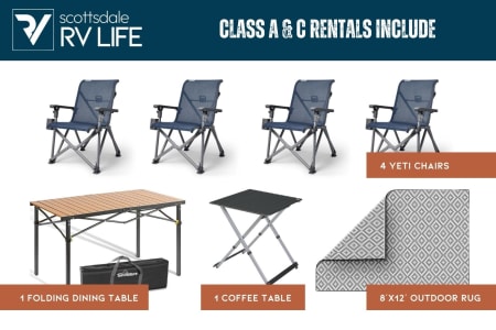2 Yeti brand camping chairs, outdoor rug, and dining table all included!