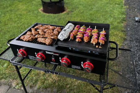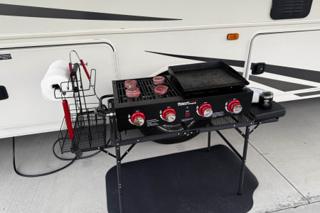 Outside, unwind in the included camp chairs or fire up the grill/griddle combo for an easy meal under the stars.