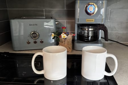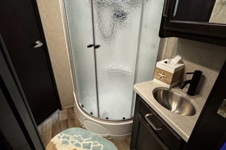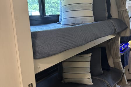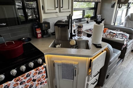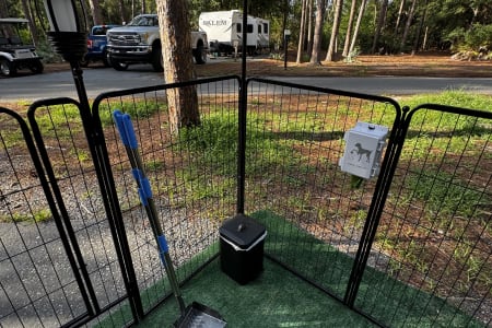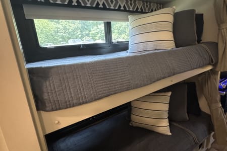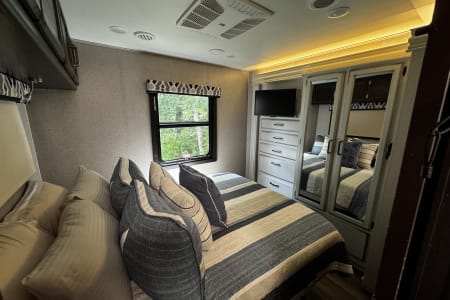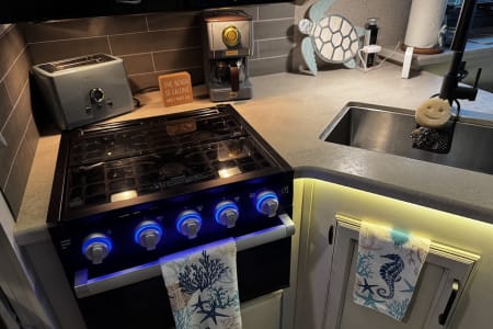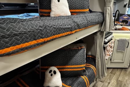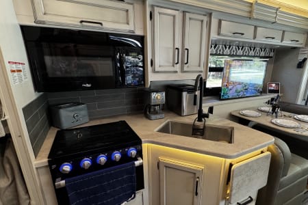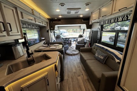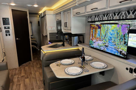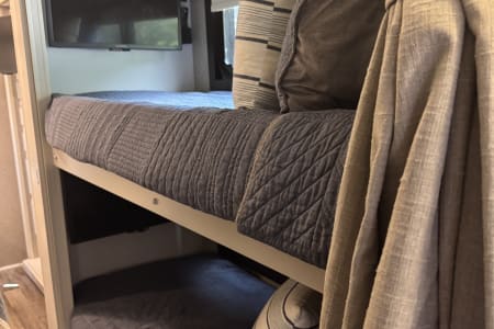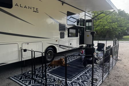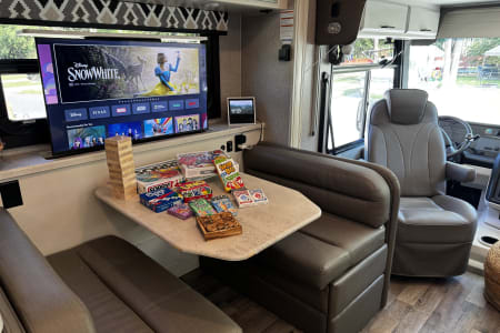 We’ve outfitted it with all the comforts of home—Starlink high-speed internet, 5 smart TVs (including an outdoor TV, one in each bunk, the main bedroom, and at the dinette), a stocked kitchen, spacious bathroom, and cozy sleeping spaces with added memory foam topper. Pets are part of the family, so they stay free, with optional pet fencing available.