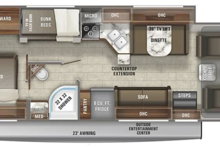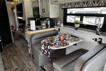 Our fully loaded 2021 Jayco Alante 29F is delivered, leveled, and ready for you to step inside. This Class A coach sleeps 6 comfortably with a queen bedroom, twin bunks, convertible dinette and sofa, plus a powered overhead bunk.