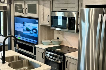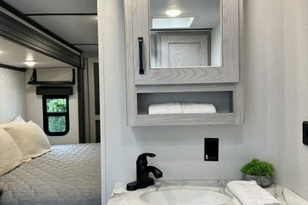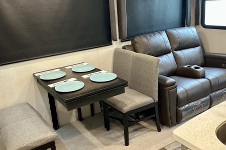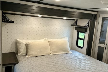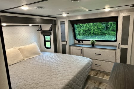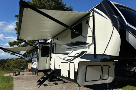 Luxurious camper perfect for a family of four! Features a king size bed, full-size refrigerator, full-size kitchen sink, reclining chairs, and a couch that turns into a sleeper. We also include a full-size air mattress. The kitchen includes: coffee maker, silverware, knives, grilling, and serving utensils, cutting boards, dish towels, and cloths, plates, bowls, and serving bowls, aluminum foil, grill lighters, salt and pepper, cooking oil, spices, pots, and pans, dish soap. The bathroom includes washcloths, towels, hand towels, RV, toilet paper, hand soap, shampoo, and conditioner, and body wash. For outside entertainment, we supply four folding chairs with two folding tables, area, rug, charcoal grill with accessories, folding table for cooking, Edison style string, lights, and 4 inner tubes. This RV is delivery only. We will deliver, set up, and pick up to your destination. The first 50 miles is $150 and each additional mile is $3.50 per mile. The cleaning fee is $75. We are pet friendly with a pet fee of $50. Small dogs only. When scheduling your campsite, remember that this rig has three slide outs, is 34 foot long, and needs 50amp power supply.