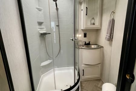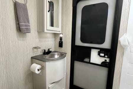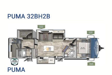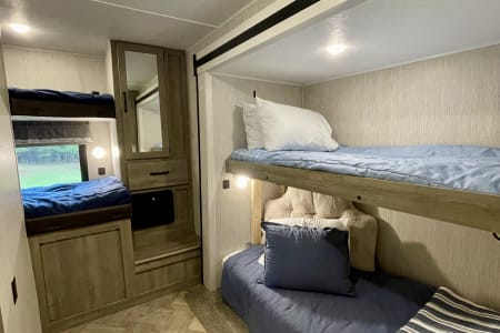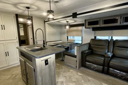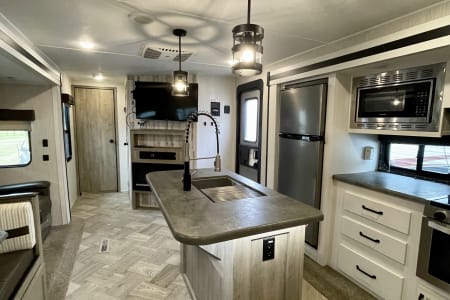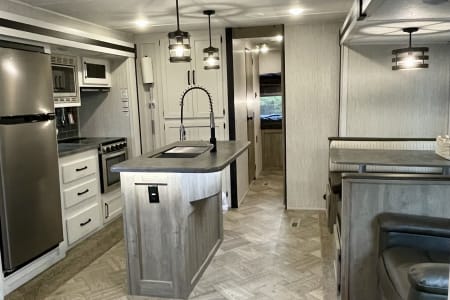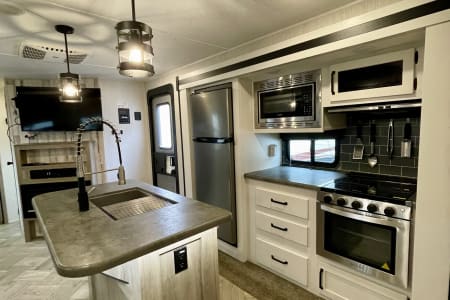 This RV delivers the space, comfort, and features you’ll need! With two full bathrooms, a private queen bedroom, a spacious bunk room, and a bright open living space with a large kitchen island that is perfect for meal prep! This RV sleeps up to 8 people and has a nice outdoor kitchen area that is perfect for entertaining!