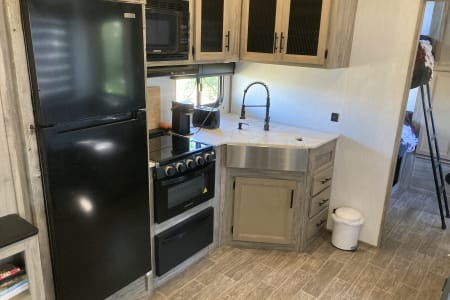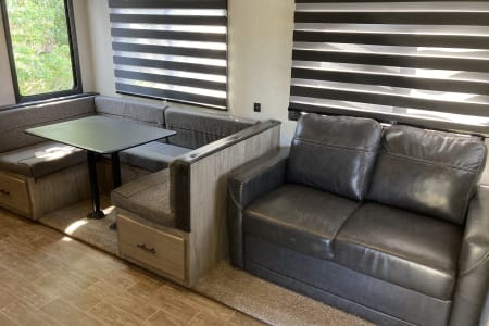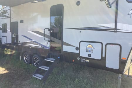 Travel in style to your favorite camping destination or experience new sights while residing in this modern fifth wheel RV. Plenty of room with this floor plan to accommodate several people, including an outdoor propane stove, mini fridge and ice maker.
