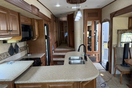 Welcome, thank you for considering our home on wheels! We are Darin and Brandy and we love spending time outdoors in our RV. We both enjoy and take pride in working on our vehicles and toys so you can rest assured that our trailer is in great shape and well maintained. This trailer offers 3 slideouts creating a large comfortable space. The bedroom features a king sized memory foam bed with it's private upper level and a smart tv and blu-ray player, closet storage 4 drawer dresser and its own AC unit. Under the bed storage has a queen size self filling air mattress that fits the living room floor space in front of the electric fireplace heater for extra sleeping possibilities. The bathroom offers a walk in shower with dome top so showing is comfortable even for taller individuals. The toilet is comfort height so no worries of your knees hitting your chest and a self cleaning bidet. Cabinet space and medicine cabinet provide storage for all your bathroom needs. A new fan in the bathroom removes moisture and is remote controlled providing air movement through out the trailer, set the temp it will automatically turn off and on depending on the trailers temperature. Led lighting throughout the trailer ensures low power demand maximum visibility. The kitchen is amazing with it's island and large counter space, double sink, plenty of power outlets, microwave, vent,. 3 burner stove, oven, fridge, freezer and basic cooking utensils, fully stocked knife block, coffee pot, counter top ice maker and additional thermostat controlled fan to ensure the trailer remains comfortable. Dining table offers 4 chairs and table with leaf for a little more room. The living room has 2 recliners, a coffee table between with 2usb ports inside. A 46" Samsung smart tv sits above the electric fireplace heater, whole RV stereo, room selectable audio, DVD, Bluetooth connectable and surround sound audio to enjoy quiet time inside. A cabinet full of DVD's and blu-ray are offered for use. A pull out desk tray is available if you have work to do. The 2 person couch folds down into sleeping possibilities, it looks small but I have slept on it myself comfortably with a dog or two at the same time. 2 outdoor tables are provided plus an outdoor kitchen prep table if you want to prepare things/ cook outside. A handheld vacuum, and broom are ready for your use. The main area of the trailer is cooled by a 15000btu AC unit thermostat controlled, a ceiling fan with led light and blackout blinds. For dry campers a 60 gallon freshwater tank, new 5 gallon per min pump with pressure tank so no pressure loss while your showering if your other campers run a faucet. 10 gallon hot water tank. Optional 2 3500watt propane generators capable of running in parallel at 50amp service allowing both AC units to work and still have power available for your entertainment needs. Outdoor electric awning can be used in low wind times and provides a nice shaded area while you're home, we do ask you retract it while you're away to prevent damage.