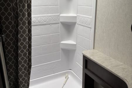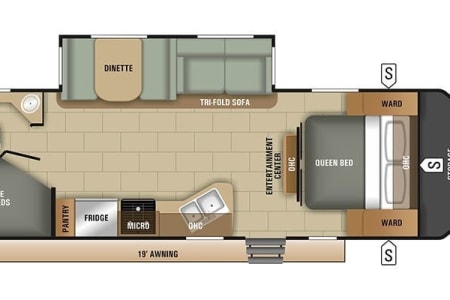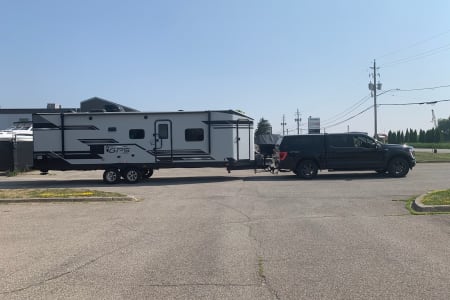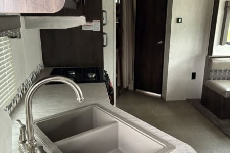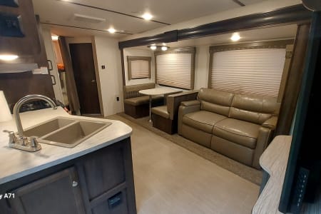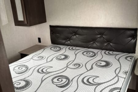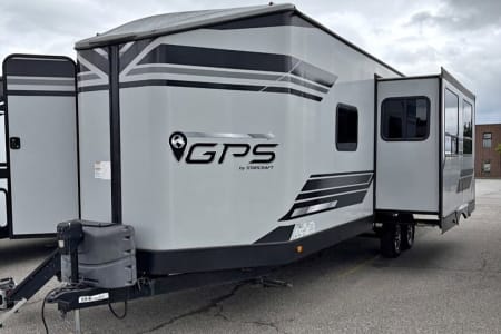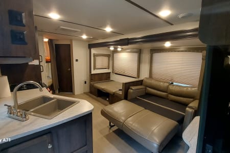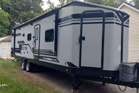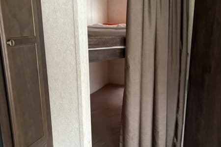 Ready for family adventures? Enjoy camping in this unique 33 ft trailer! Its got privacy for the parents and ample room for kids! There is a queen bed in the master, double-over-double bunk beds, a pullout couch and a collapsing dinette makes for lots of sleeping space. This bunkhouse has a maximum sleep capacity of 10 but comfortably sleep 8 adults. The large driver side pop-out gives lots of open floor space! There is a TV for those rainy days with provided DVDs to choose from!