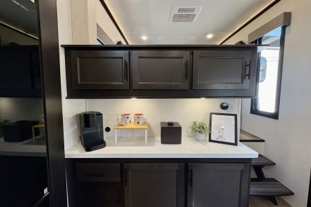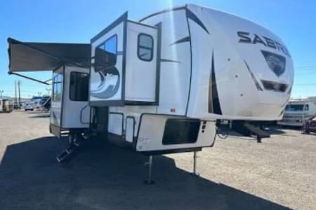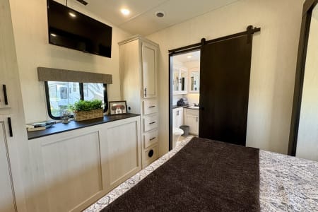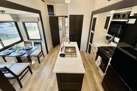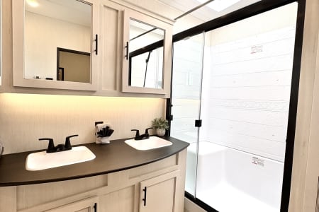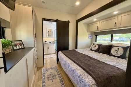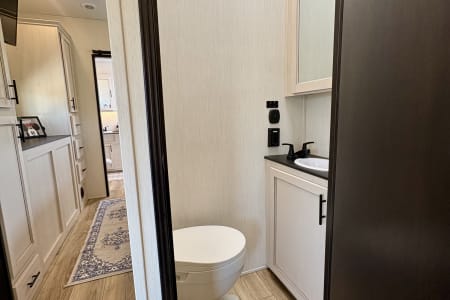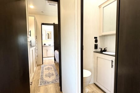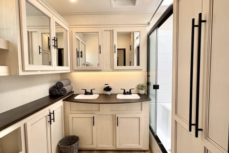-Beds: Rear master bedroom with camper‑king bed and full bathroom (with double‑sink vanity), plus half bath in midsection
