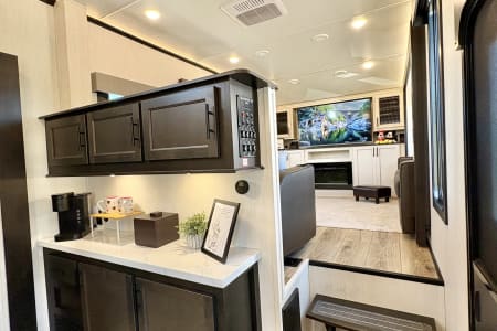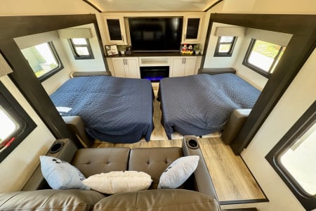 -Living Area: Front living area with two tri‑fold sleeper sofas and theater seating, plus entertainment center and fireplace