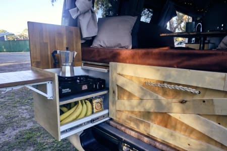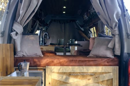 Step inside and you’ll find smart, thoughtful features that bring comfort to the wild: a spacious interior, a comfy bed, a compact kitchen for fresh meals on the go, and clever storage for all your gear. With our van, you don’t just travel—you live the adventure, creating stories you’ll tell for a lifetime.