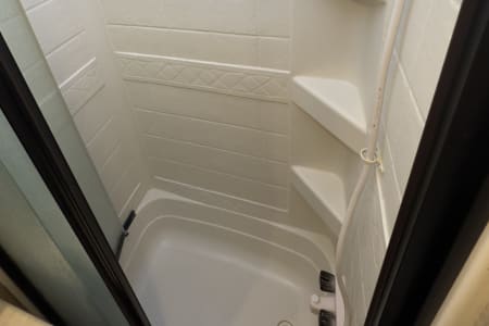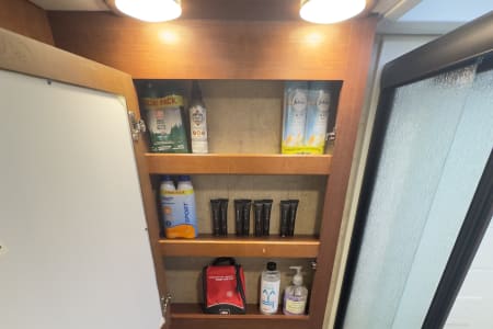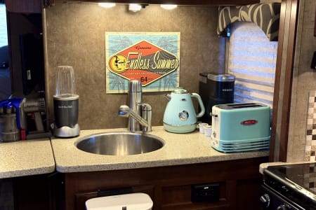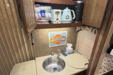 The fully stocked kitchen includes a Suburban three-burner stove with gas oven and overhead Advent microwave , exhaust fan, fridge, freezer, cookware, utensils, plates, cups, coffee maker, toaster, kettle, sponges , paper towels, cleaning supplies, trash bin and basically everything to make you feel like you’re cooking right at home.