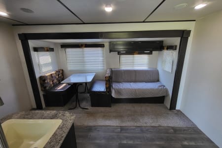 **Living Area:** A large kitchen equipped with a booth dinette for dining or working, and a full-size television for entertainment.
