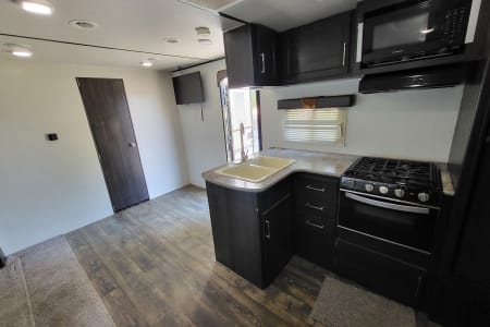 The trailer also boasts a slide out with a fully equipped restroom featuring modern fixtures like glass showers and vanity sinks, ensuring comfort after a long workday. The common living area includes a full kitchen with a convection stove, microwave, and refrigerator, plus a booth dinette, couch and television for communal dining, relaxation, or entertainment.