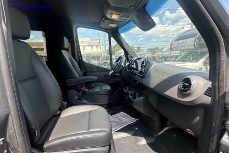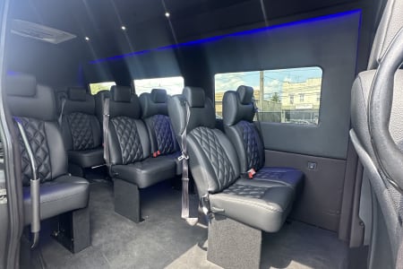 Beautiful 14 passenger sprinter custom seating that recline, lighting with dimming option, charging station in every row, wifi, Tv with streaming apps logged in, massive trunk space and more.