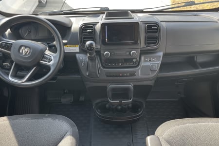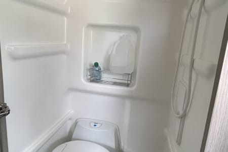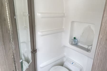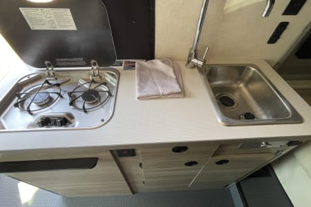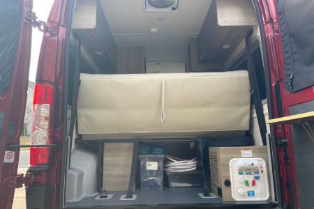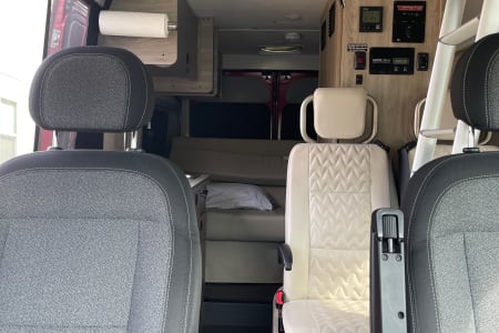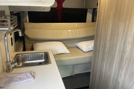 6 seatbelts, sofa bed and pop-top bed. 20 gal on board water tank, 22 gal grey tank & 5 gal black tank easy removable cartridge to dump. Propane stove and heat Solar electric for usb outlets and runs lighting/small fridge.