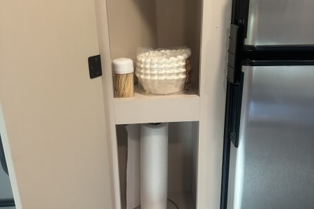 • Kitchen Amenities: Equipped with a 2-burner stove, induction stovetop, convection microwave (you can even cook a pizza in there), mid-size refrigerator and freezer(electric/propane), and a double sink with cover for meal preparation ease.