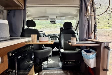 - Both driver and passenger seats swivel with ease to expand the living space even further. When swiveled, pull-out tables are accessible for both seats to create a quick and comfortable dining or work space.