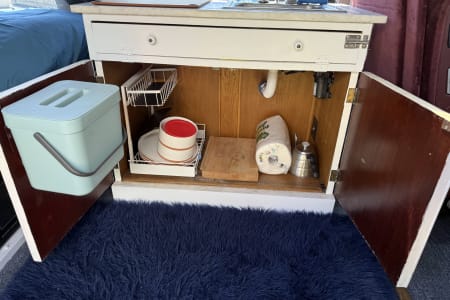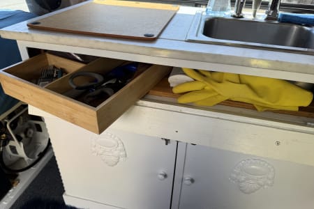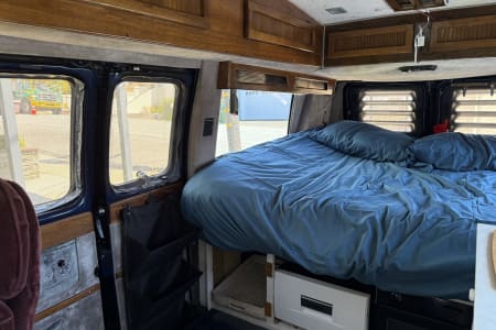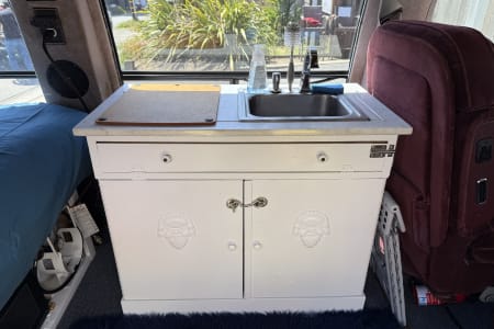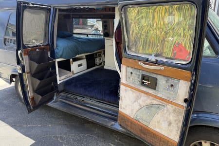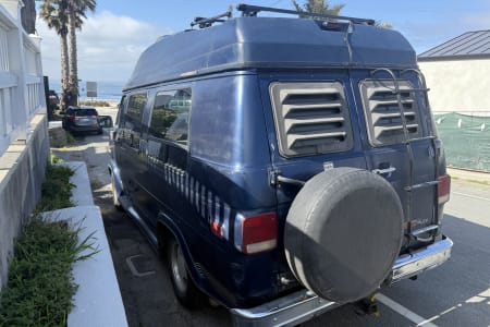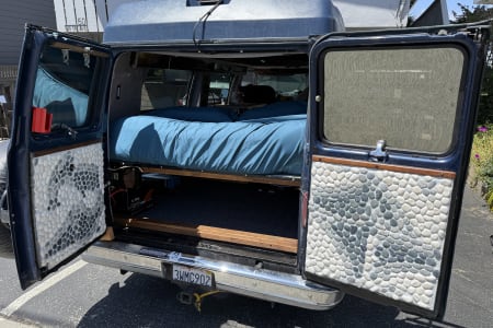 This camper is perfect for those who are looking for a cool vintage van with essentially everything you need in a trip, whether it’s long or short. The Shiner is named after the characteristic scar on his face, legend has it he got that shiner while fending off a horde of ravenous tiger sharks! He now wears it as a badge of honor, and a reminder that sharks think big blue vans are tasty. Cruise the island in this stealthy cozy ride! See all the details below for a list of items/amenities that The Shiner offers!