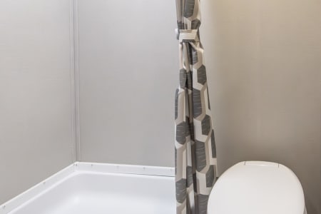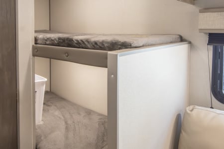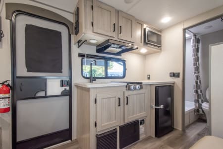 This travel trailers is perfect for a young family or smaller group. You can easily sleep four or more with the rear set of bunk beds and queen bed up front. There is also a 60" sofa for inside down-time, as well as complete kitchen and bath amenities so you can cook and stay clean while traveling. The rear corner bath features a toilet and 36" x 30" shower, and it's conveniently located next to the bunk beds which is great for little ones at night. Cooking inside will be easy with a GE stainless two-burner cooktop and single sink, plus there is also a GE microwave oven for snacks and things that you can easily warm up. If you plan to spend most of your time outdoors, you will find plenty of storage space in the front exterior storage compartment, and there is also plenty of storage inside as well.