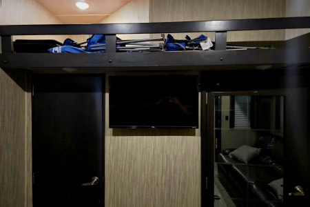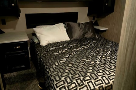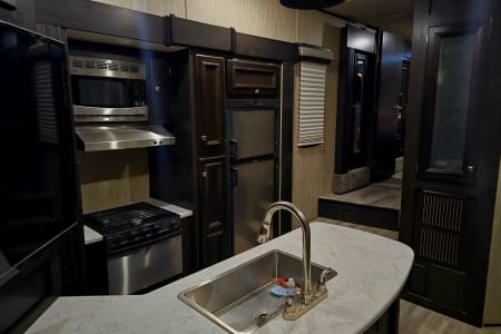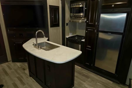 Experience the ultimate blend of comfort and adventure with the 2018 Heartland Fuel 352, a spacious and well-equipped fifth-wheel toy hauler. Perfect for families, large groups, or outdoor enthusiasts, this RV is designed to be your home away from home. With three slide-outs, the interior feels open and inviting. It can comfortably sleep up to 8 people, featuring a private front master bedroom with a queen-size bed, a separate loft bed, an electric bunk in the garage, and a convertible sofa/dinette. The central kitchen is ready for all your cooking needs, featuring a stainless-steel sink with a residential-style faucet, a microwave, an 8-cubic-foot refrigerator, and a three-burner cooktop with an oven. Enjoy the convenience of a full bathroom with a spacious shower and skylight, plus a second half-bath accessible from the garage area, a feature that's highly sought after in toy haulers. ​Whether you're heading to the dunes, the mountains, or just a weekend getaway, the 2018 Heartland Fuel 352 is the ideal rental for those who refuse to compromise on comfort or adventure.