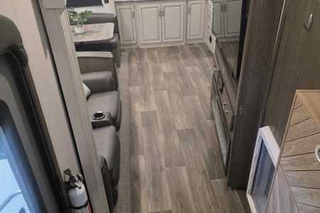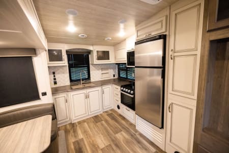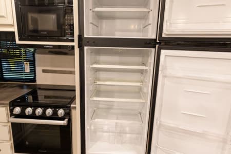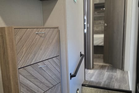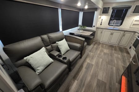 With two electric awnings, outdoor speakers, and storage for all your camping gear, setting up at the campsite is a breeze. Whether you’re grilling, lounging, or enjoying a family game night under the awning, this RV has you covered.