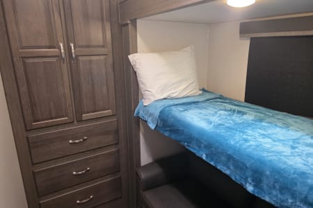 Private Bunkhouse: Perfect for kids, teens, or guests with a sofa, flip-up bunk, and even a desk for work or school on the road.