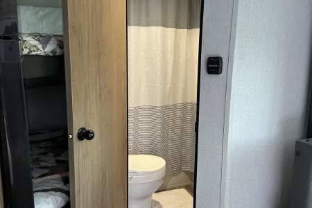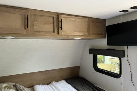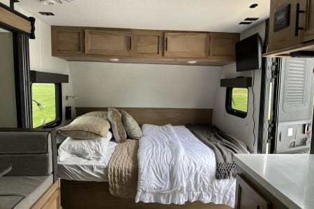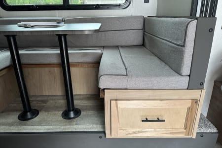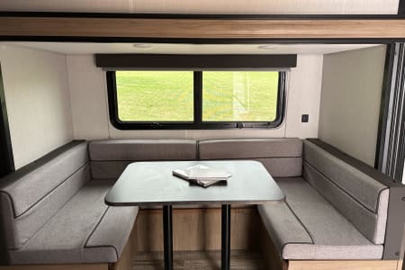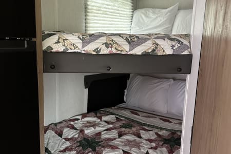 Spacious Layout - sleeps up to 5 comfortably with a queen bed, dinette conversion, and full bunks.