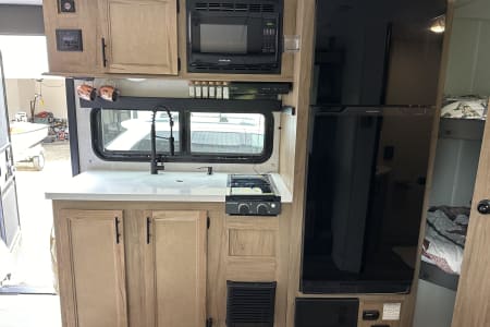 Fully equipped Kitchen - sink, stove, microwave, refrigerator, and plenty of storage