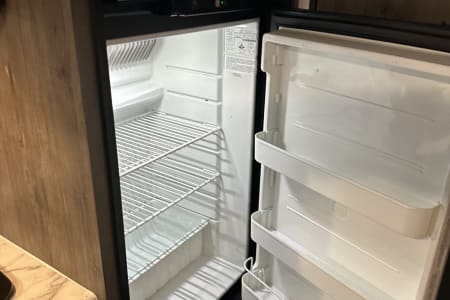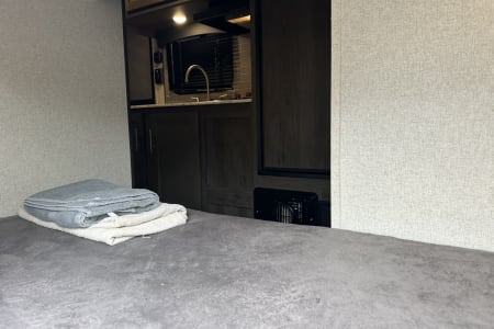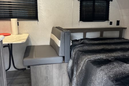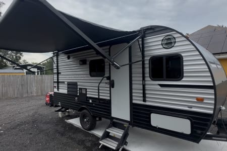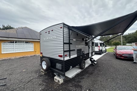 Outside, the large awning extends your living area, perfect for morning coffee, shady afternoons, or evening gatherings under the stars. Compact yet spacious, this trailer blends convenience, charm, and functionality—making every trip feel like a getaway retreat.