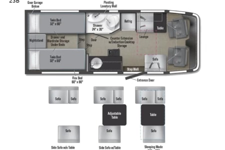 Primary sleeping in the rear with either a queen bed or two twins then a convertible lounge upfront and a pop-up full sleeper above.