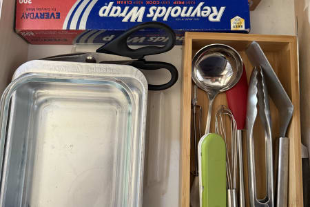 Full galley kitchen with fridge, counter hot plate, microwave, and cookware.